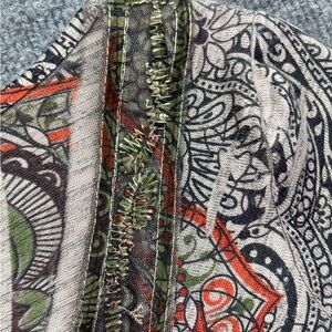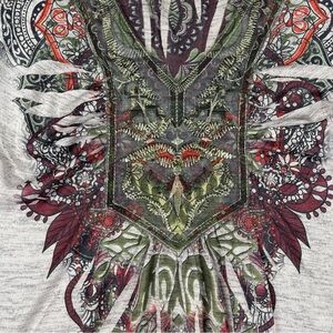 Energe by OneWorld Shirt Womens Small Beige Grey Heather Green Orange Red Embroidered Print Multicolored Mixed Media Mesh Beaded. 3/4 Length Sleeves. Very Good Pre-owned condition. No found flaws or stains. See photos for measurements. Ships quickly from smoke-free home.