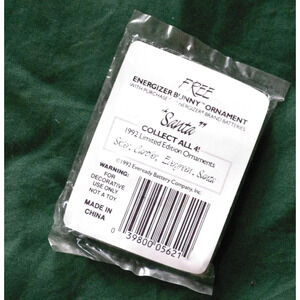 Distributed by Eveready Company with purchase of batteries during Christmas season 1992, clear acrylic Christmas tree ornament depicting Energizer Bunny in Santa hat, beating bass marching drum.
