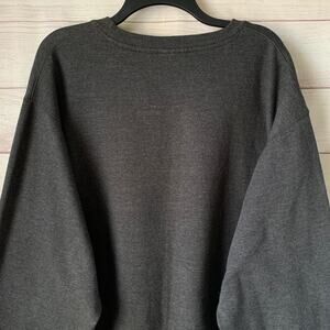 Men's charcoal gray pullover sweatshirt by Energy Zone. It has a ribbed crew neckline, long sleeves with ribbed cuffs, and a ribbed bottom band. It is pre-owned with some very light variations in color or possibly some spots on the bottom front left and right bottom sleeve, but is otherwise in great condition.