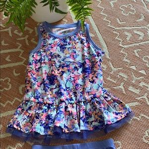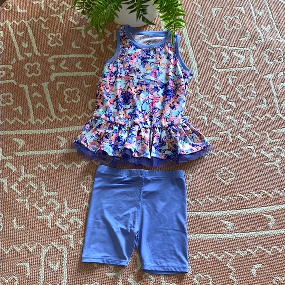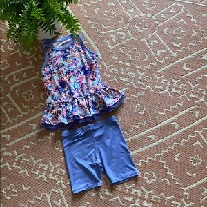 Set is in excellent condition, super cute , purple spandex shorts , top is about the same material, beautiful in color , beautifully detailed, gently worn , very well taken care