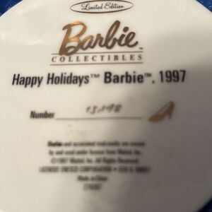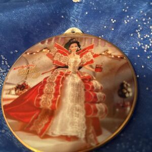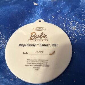 Celebrate the season with the Enesco Barbie 1997 Happy Holidays Barbie Porcelain Ornament. This 3-1/2" round hanging ornament captures the spirit of Christmas with its classic design, featuring the beloved Happy Holidays Barbie character. Crafted from high-quality ceramic and porcelain, it's a delicate addition to any holiday collection.
