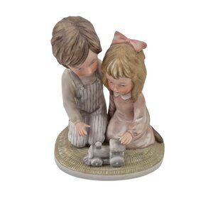 A nostalgic collectible figurine depicting a boy and girl playing with a toy train. Crafted in delicate porcelain with hand-painted details for timeless charm.