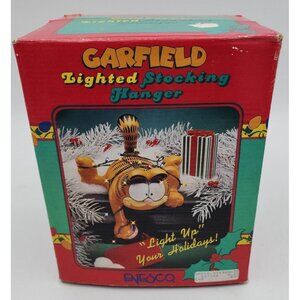 This Enesco Garfield light-up holiday stocking hanger from 1978, standing 7 inches tall, adds a whimsical glow to your holiday decor. Fully operational and comes with the original box.