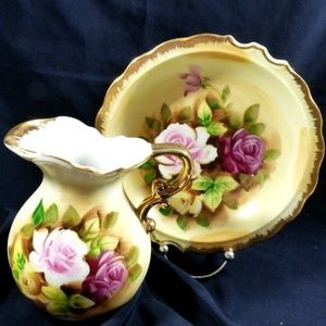 Enesco Hand Painted Roses Gold trim Pitcher & Bowl porcelain Victorian style set