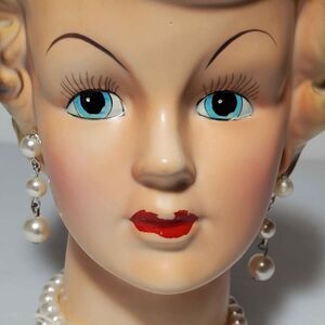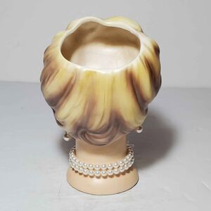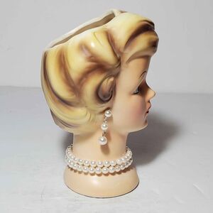 Vintage Enesco lady head vase planter. Faux pearl necklace and earrings. Paint loss on lips. Prior owner wrote on the bottom. Blonde hair, open eyes. Hard to find. Made in Japan, See all pictures.