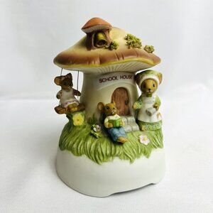 Amazing Enesco Country Calico Mice music box that plays School Days tune. The music can be wound up in the back and turned on or off by sliding the lever. The schoolhouse is a mushroom with 3 mice, a teacher mouse, a young boy mouse sitting on the stairs reading a book and a young girl mouse sitting on a swing. Made of porcelain bisque. Great for anyone who collects mouse figurines, schoolhouses, or mushrooms.