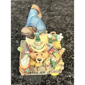 Enesco Moose Creek Crossing “Drinks Are On Me!” 1996 Drunk Bear Tripping Figurine #188395. Designed by David Olsen.