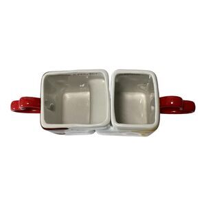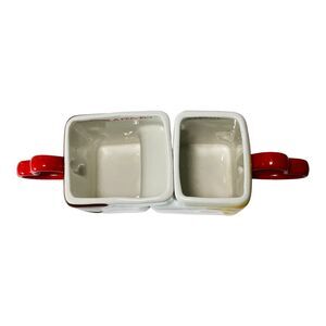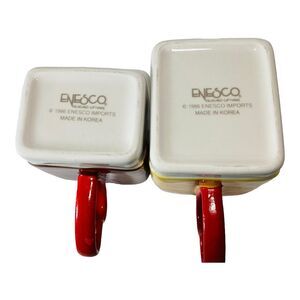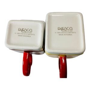 This vintage Enesco coffee mug set is the perfect gift for Valentine's Day. The set includes a His and Hers coffee mug, both made of high-quality ceramic and porcelain material. The mugs are white in color and can hold both hot and cold beverages. The mugs were manufactured in Korea in 1986 and are an original piece from the Enesco brand. They are perfect for collectors or for daily use. Hand wash only is recommended for care instructions. There are 2 small paint repairs as can be seen in pictures.