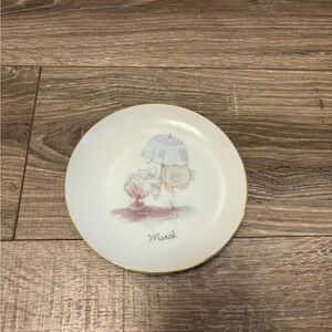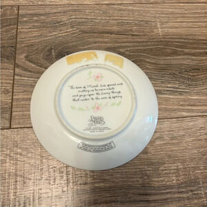 This collector plate from Enesco's Precious Moments product line features a round shape with a diameter of 6.25 inches. The plate is made of porcelain and comes with a stand included. The plate's design showcases the theme of "Months of the Year" and specifically highlights the month of March.