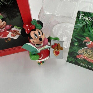 This Enesco Treasury ornament from 1994 features Disney's beloved Minnie Mouse in a heartwarming scene of baking cookies. The colorful ornament is made of mixed materials and measures 3 inches in height and 2 inches in width. It comes in its original box and is ready to be hung on your Christmas tree.