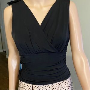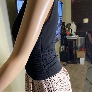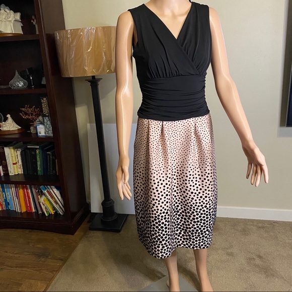 Enfocus...Black and pink velvet in the bottom part of the dress with with pockets and cotton sleeveless crossed black top it’s a very nice confortable fun and beautiful dress.