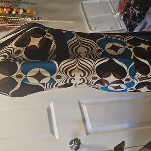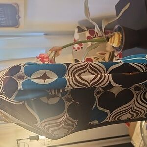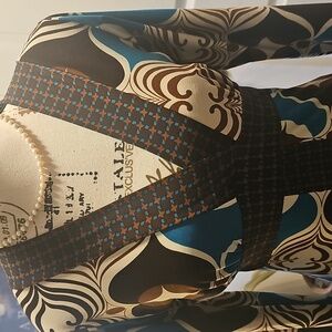 Elegant dress with a striking pattern. Features brown, cream and blue hues. Ideal for stylish outings. Looks like a wrap dress for all we small breasted women who have trouble pulling off that kind of look! The fabric is so soft and flexible. Think brown or the perfect shade of blue heals and this dress becomes a real head turner!