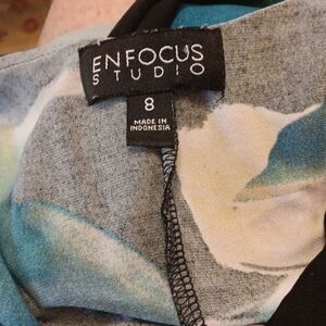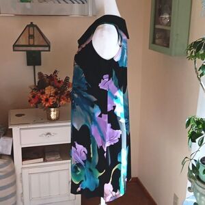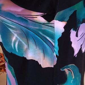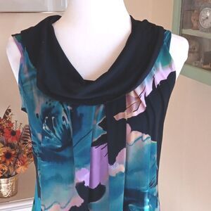 This shift dress is comfortable and flattering. The graphics are dark and dramatic. Cut in shoulders under a black picture collar. Pleated at front neckline for a fuller bodice. Size 8 measures 36 at chest, 40 at waist, 44 at hips, 36 long from shoulder to hem. Comfortable all year round.