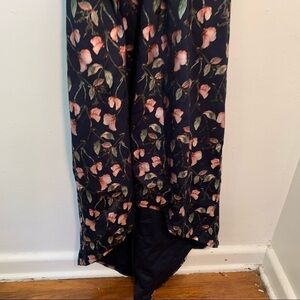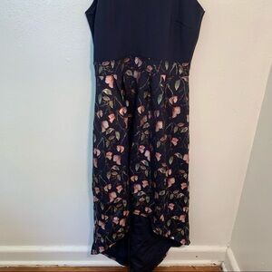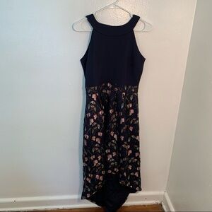 Great condition. Enfocus studio. High low dress. Sleeveless. High neck. Keyhole in back. Solid navy top with navy and blush pink floral skirt. Style 61139. Size 8. Stretch 95% polyester, 5% spandex. Pit to pit laying flat 17” Shoulder to hem 40”/53”. All measurements are approximate and taken lying flat. Smoke free home. No trades, offers welcome.