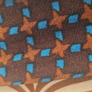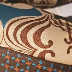 Elegant dress with a striking pattern. Features brown, cream and blue hues. Ideal for stylish outings. Looks like a wrap dress for all we small breasted women who have trouble pulling off that kind of look! The fabric is so soft and flexible. Think brown or the perfect shade of blue heals and this dress becomes a real head turner!