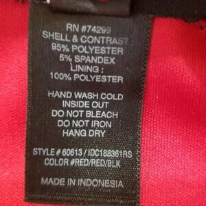 Enfocus Studio Women's Red & Black Holiday Sheath Party Dress - Size 14; Material - Shell & Contrast - 95% Polyester, 5% Spandex; Lining - 100% Polyester; Care - Hand Wash Cold, Inside Out, Hang to Dry; Made in Indonesia; Boat Neck, Cap Sleeves, Pleats at Left Waist Front & Back, Attached Black Skirt, Knee Length,