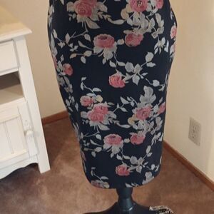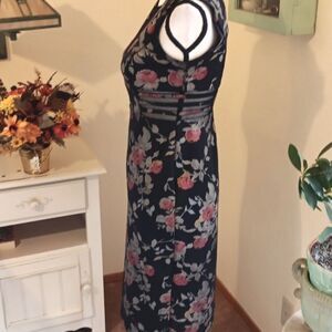 This dress is a floral bodycon piece. The V neck and opening at the sides have net so that YOU show through. Size 4 measures 36 at chest, princess seams. 28 at waist. 36 at hips. 39 long from shoulder to hem. 33 at bottom hem for a perfect pencil shape. This fabric is more structured and flattering to your curves. You'll love it.