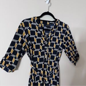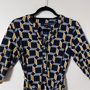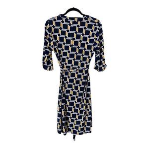 Enfocus Studio Blue/Mustard Yellow/White V Neck Tie Front Midi Dress Size 8. A classic 3 button up stretchy short sleeve dress. Tie belt. Excellent used condition!