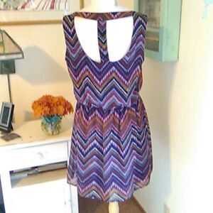 Native rug design graphics on this semi sheer fabric. Fully lined. Pretty open back with straps. Pleats at neckline. Size 14 measures 44 at chest, 30-44 at waist, 46 at hips, 37 long from shoulder to hem. Beautiful colors for all year.