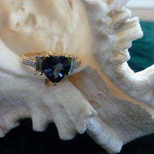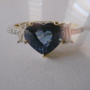 This is not your Mom's engagement ring. It's BLUE SPINEL, heart shaped and faceted with mixed cut. At 2.08cts, it's LI clarity with a slightly abraded culet. Step cut baguette diamonds either side, 0.15cts SI2/I1 clarity, H color. Colored gems are trending and an intense evenly distributed violet blue spinel, is a rarity. Original certificate of authenticity, and copy of the independent appraisal ('cos I have other pieces on it), will be furnished. Size 7, 18K yellow gold. NWOT.