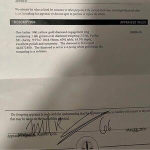 Lab grown diamond, gold band, less than a year old. Have appraisal papers. Cleaned. Appraised at 9,000. Serious inquiries only.