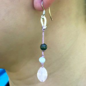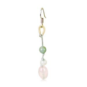 With its pastel appearance, the oblong Rose Quartz Earrings are a subtle and chic addition to any ensemble. It features jade beads in the center of the short silver drop rope leading the eye to the oblong rose quartz beads at the bottom. They connect to the ears using silver-toned ear hooks.