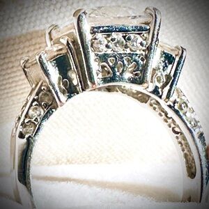 Stunning emerald cut ring featuring a large gemstone in between two smaller identical gems. Intricate band design.