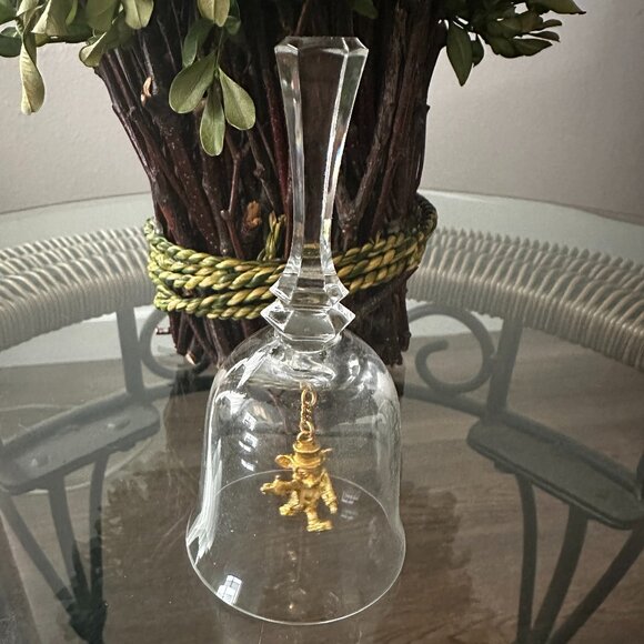 The crystal bell has a gold tone metal dangling Character from Disney that is attached by a epoxy glue.