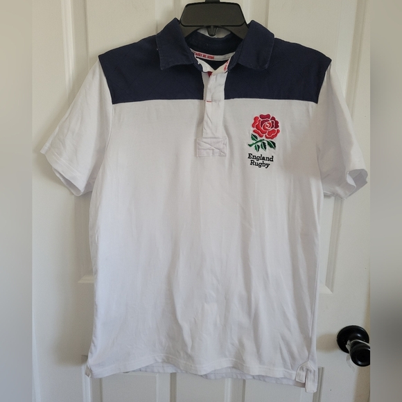 This England Rugby Men's White Navy Rose Polo in size Small features a solid multicolor design with a collared neckline and short sleeves. Made from 100% cotton, this pullover polo is perfect for travel, activewear, and casual occasions, especially suitable for rugby-related activities. The design showcases the iconic rose emblem, highlighting a sports theme that aligns with the performance and activity of rugby. Perfect for all seasons, this polo offers a comfortable and stylish option for rugby enthusiasts.