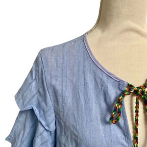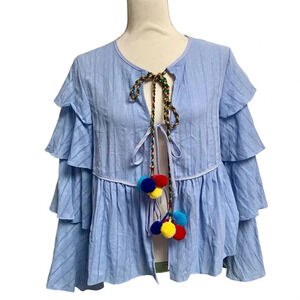 English Factory Blue Pom Pom Tie Top Tiered Sleeve Blouse Size Small
