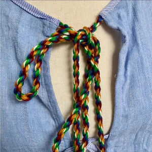 — Color: Blue with striped ties + multicolor pom poms