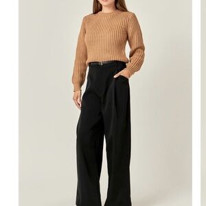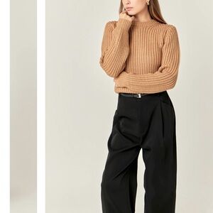 This English Factory sweater features a rich brown hue and a classic crew neck design. Crafted with a ribbed knit texture, it offers a cozy and stylish fit. The long sleeves and cropped length make it a versatile addition to any wardrobe.