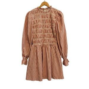 English Factory Burnt Red Long Sleeve Gingham Smocked Mini Dress Size Small