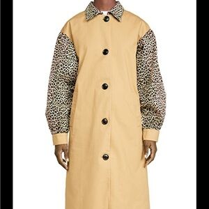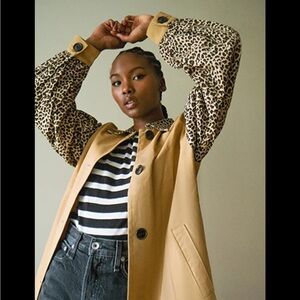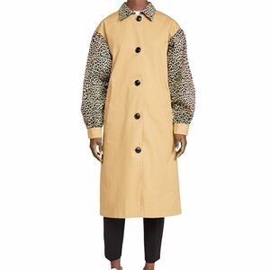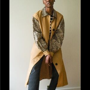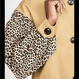 Adorable trench coat from English Factory. Tan center with contrast leopard sleeves and collar. Black plastic buttons down center front. Pockets. Like new, without tags.