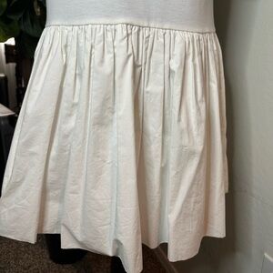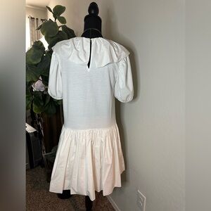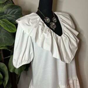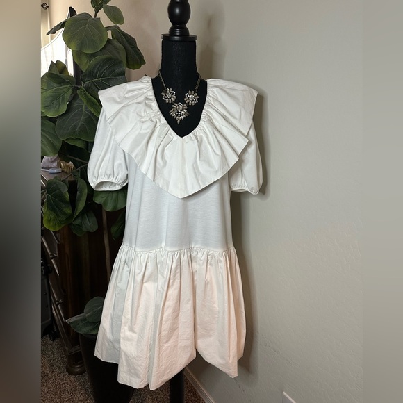 TALL FRIENDLY, FINAL SALE. Fixed price $38. fits Medium Chic cream dress with stylish ruffles. Perfect for any occasion. BNWOT. It could fit S/M it has no tag on it but it’s brand new. It’s like cottony in the sleeves and torso part.