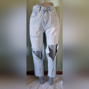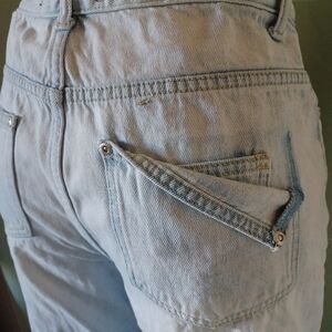 Stylish and comfortable light blue denim jeans. Perfect for casual wear. distressed detail give them a unique and trendy look. high waisted. flattering fit. plus, the flipped down pocket detail to expose a coin pocket inside the back pocket adds an extra touch of style. see pictures. they are part of the description. pre-owned in great trendy condition. measurements are approximate.