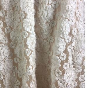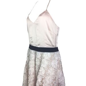 Fully lined in blush with a floral lace over skirt