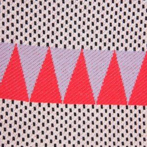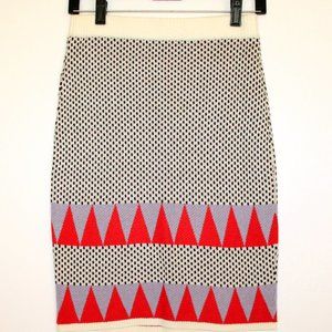 Eye-catching, slim-fitting knit skirt from English Factory. Cream background with small black rectangle pattern, highlighted by bands of red & lavender triangles. Size S. Approx. flatlay measurements - waist: 13.5", length: 22". Fabric is 55% cotton, 45% acrylic.