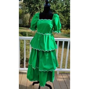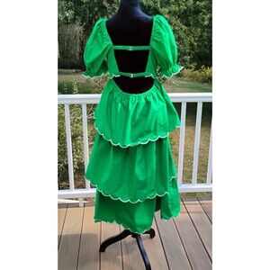 English Factory Kelly Green Scalloped Ruffle Puff Sleeve Cotton Midi Dress S NWT
