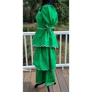 It features a unique design, including a tiered midi skirt with scalloped edges trimmed in white. The top has a flattering square neckline and stylish puffy sleeves with ruffled and scalloped cuffs. The open back is secured with two elastic straps, adding a fun, unexpected detail.