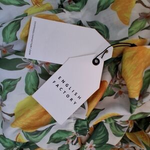 Vibrant lemon print dress by English Factory. Features green leaves and yellow lemons on a white background. Perfect for any occasion.