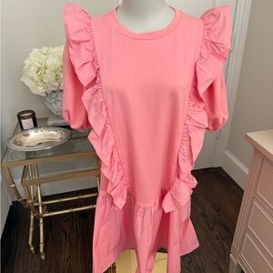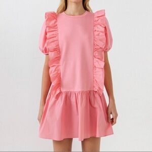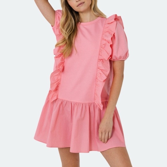 You'll love this ribbon inspired mini dress with its flirty ruffle details. The Mixed Media Ruffle Detail Mini Dress is perfect for any summer occasion! Style with sneakers and a cute little clutch to complete your look!