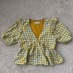 English Factory Mustard Checkered Ruffle Blouse