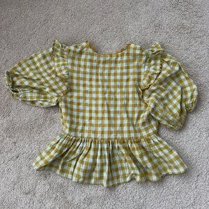 Vibrant mustard checkered blouse with ruffle details. Features puff sleeves and a flattering fit. Perfect for casual outings.
