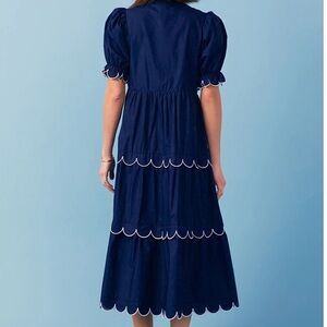 This navy midi dress is an effortless piece that lets you look dressed up. The scalloped edges and puffy sleeves give an ultra-feminine vibe. The breathable cotton fabric means you can wear this piece throughout the year; just style it with a jacket and boots when it's cooler out.