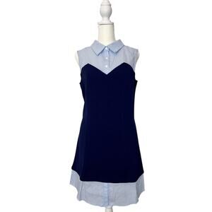 -Features: A classic sleeveless shirt mixed media mini dress. The navy structured overlay adds a sleek refined silhouette. An Oxford-style shirt with a crisp collar and 3-buttondown closure. Zips up in the back. Tailored with a modern twist and designed for versatility, ; this dress transitions seamlessly from desk to dinner!