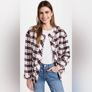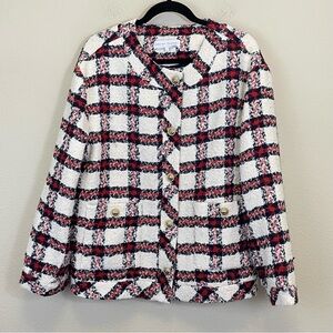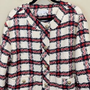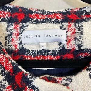 English Factory Navy and Red Check Plaid Boucle Tweed Jacket Size Large