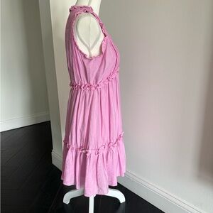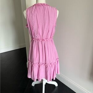 Sleeveless pink dress with ruffle details. V-neckline and gathered waist. Flowy skirt with tiered hem.