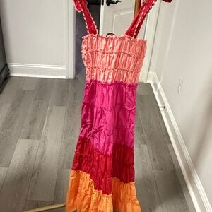 Charming pink dress with ruffled details. Perfect for any occasion.