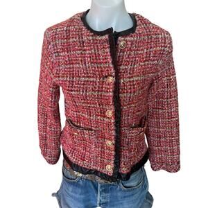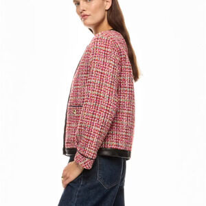 Classic boucle tweed blazer with raw hem detail, plaid pink burgundy 5 button, boxy cut, patch pockets, padded shoulders, hits at the waist from the office to a cool weekend look. Clueless, Princess Di, Ladies Who Lunch